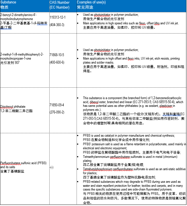 On 3 September 2019, the European Chemicals Agency (ECHA) launched public consultation for the 22nd update of the REACH Candidate List. The public consultation will end on 18 October 2019. 2019年9月3日,ECHA启动了REACH候选清单第22次更新的公众咨询。公众咨询截止2019年10月18日。 Four (4) substances were proposed. If all of the proposed substances are identified as substances of very high concern (SVHCs), the total number of SVHCs listed on the Candidate List will increase from 201 to 205 in December 2019 or January 2020. 建议增加的有四组物质,如果建议的物质都能被认定为SVHC,则从2019年12月或2020年1月,SVHC将会从201增加到205项。